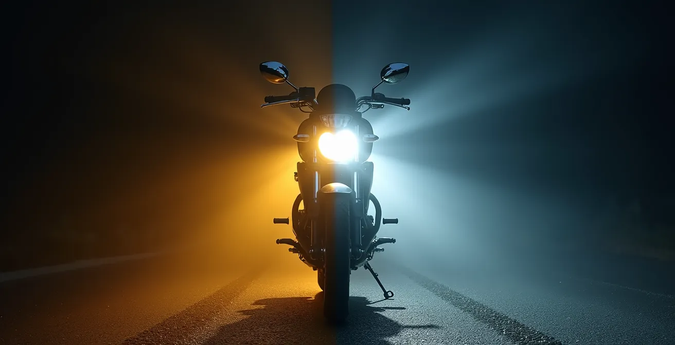 La nuit tombe, la route de campagne se rétrécit et la lumière jaunâtre de votre phare de moto semble être absorbée par l’asphalte. Chaque virage cache une incertitude, chaque bas-côté une menace potentielle. Cette expérience, familière à de nombreux motards, n’est pas une fatalité. Face à cet inconfort, la première réaction est souvent de chercher une ampoule « plus puissante ». On entend parler de LED, d’halogènes renforcées, mais le sujet est bien plus vaste qu’une simple question de technologie d’éclairage. La véritable sécurité nocturne ne se résume pas à mieux voir ; elle repose sur un équilibre complexe entre voir, être vu, et ne pas mettre en danger les autres usagers.